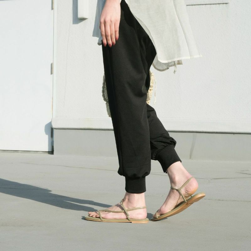 • 履く際は、つま先まで足を通し、アンクルストラップのゴムの部分を引っ張りながらかかとを入れていただくとスムーズに履くことができます。