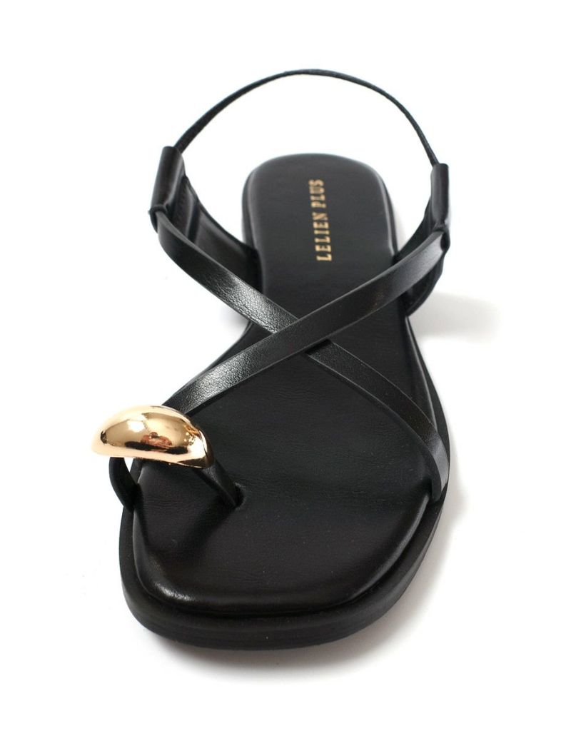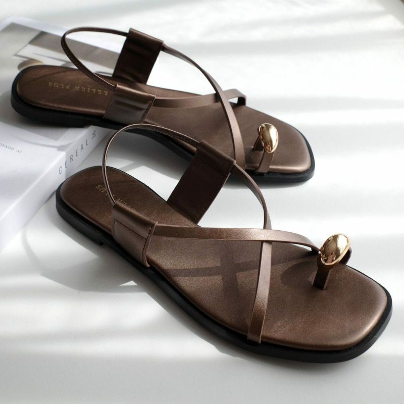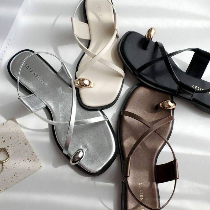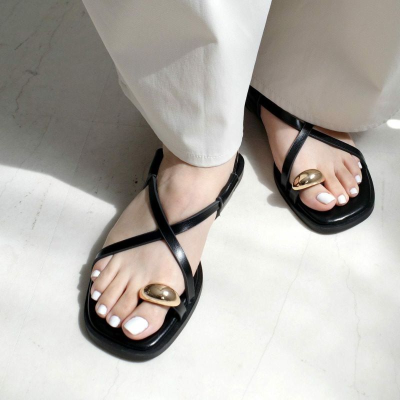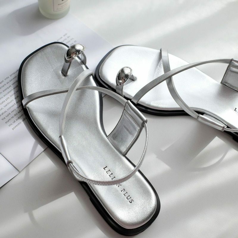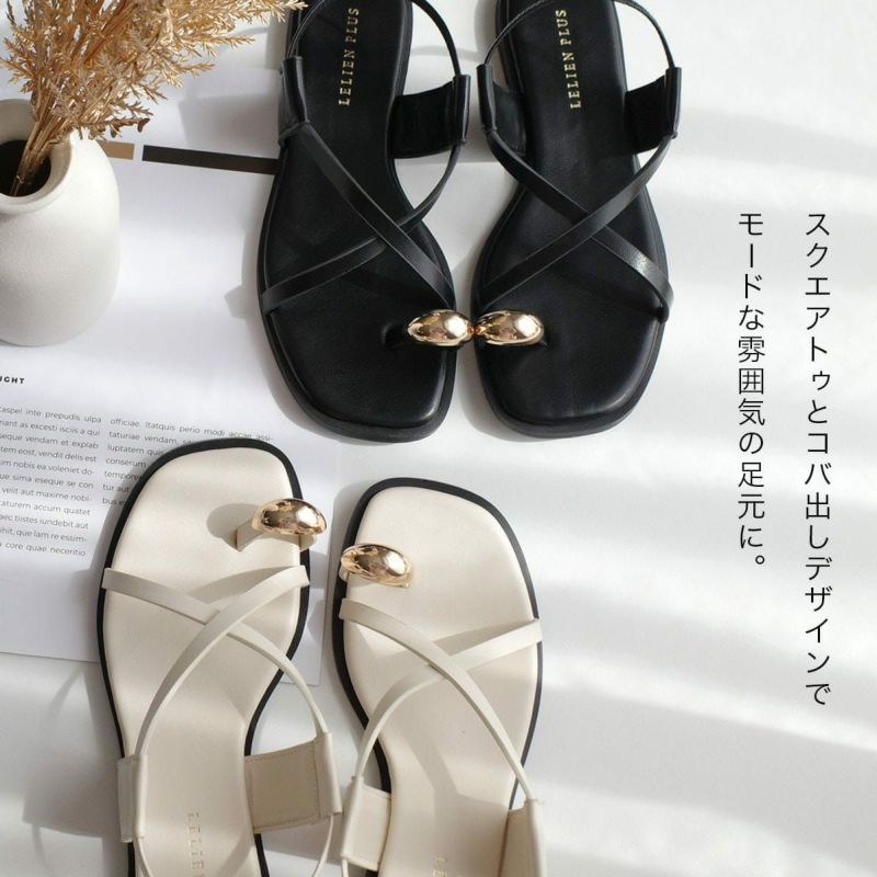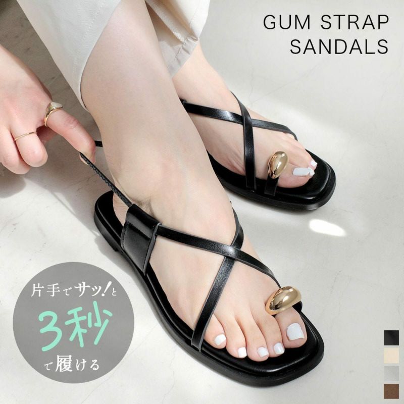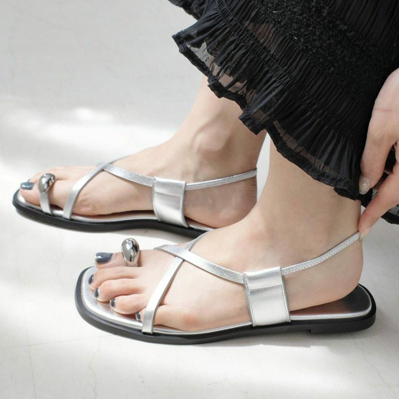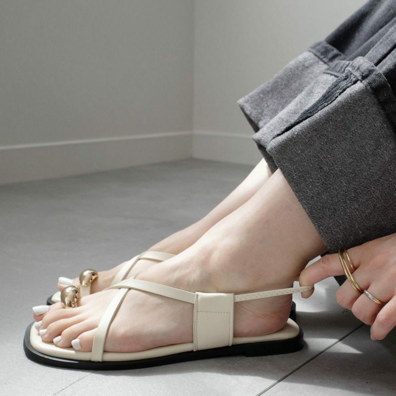 ゴールド・シルバーのトゥリングデザインで大人カジュアルに夏の足元を華やかにしてくれます。片手でさっと脱ぎ履きでき、ゴムストラップなので足に程よくフィットします。