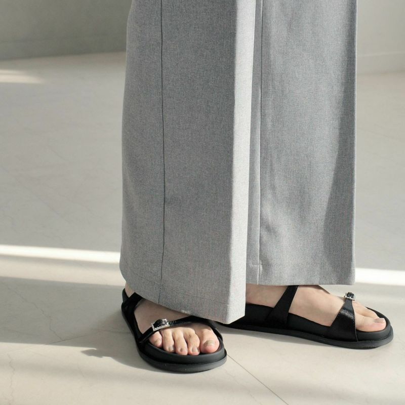 細めのサテンストラップとラインストーン付きバックルで、上品で華やかな印象に。カジュアルから少しドレッシーなスタイルまで幅広く対応できるデザインです。