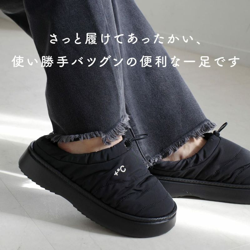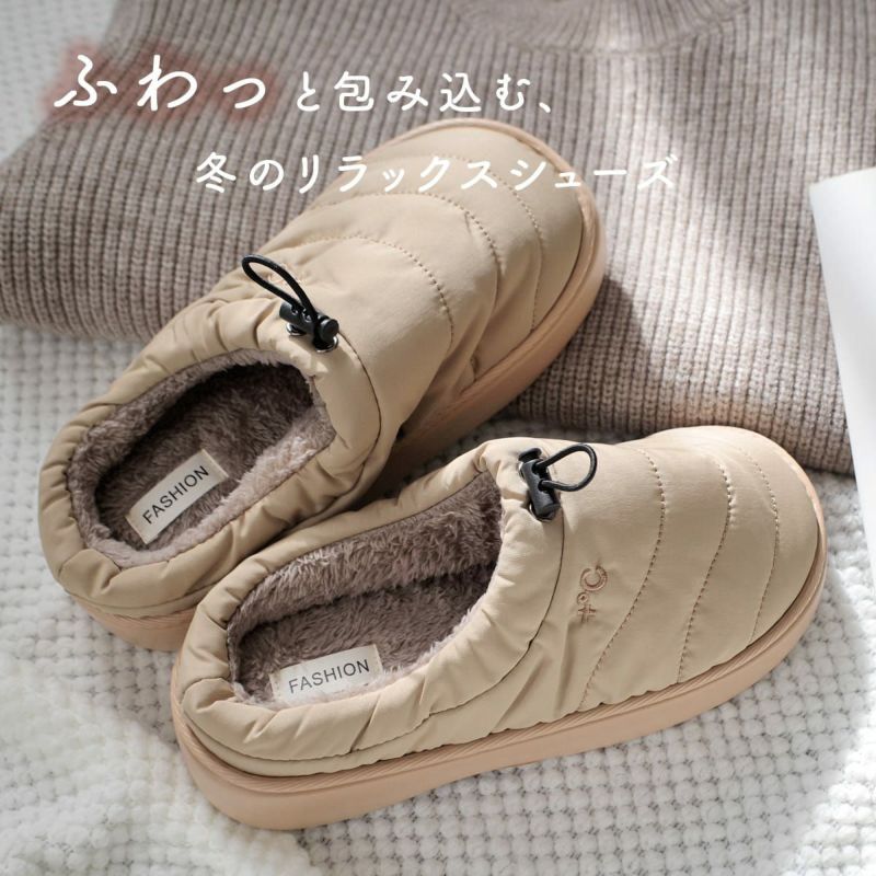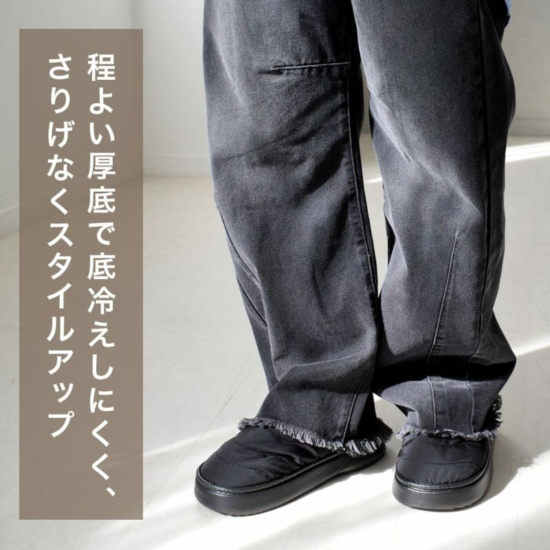 内側は柔らかなボア仕様で、素足でも心地よくあたたか。ソールは軽量ながらもしっかり厚みがあり、クッション性も抜群。