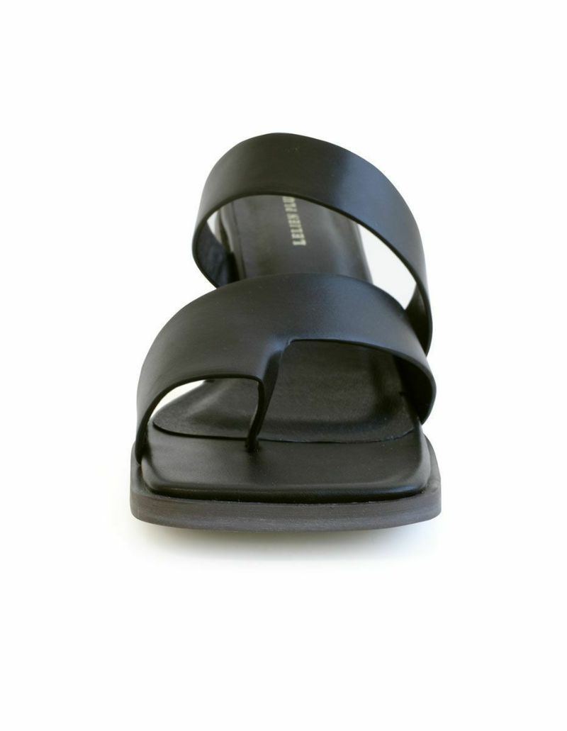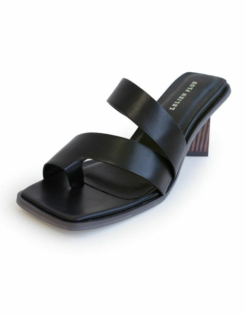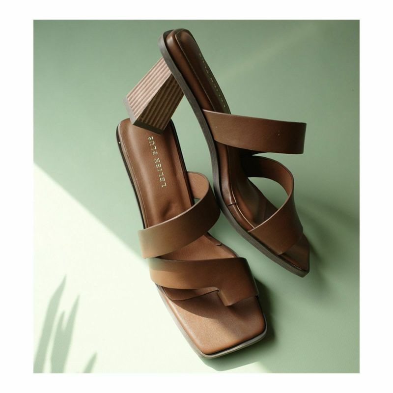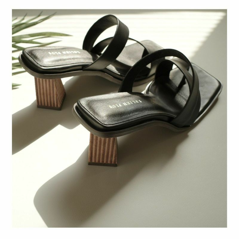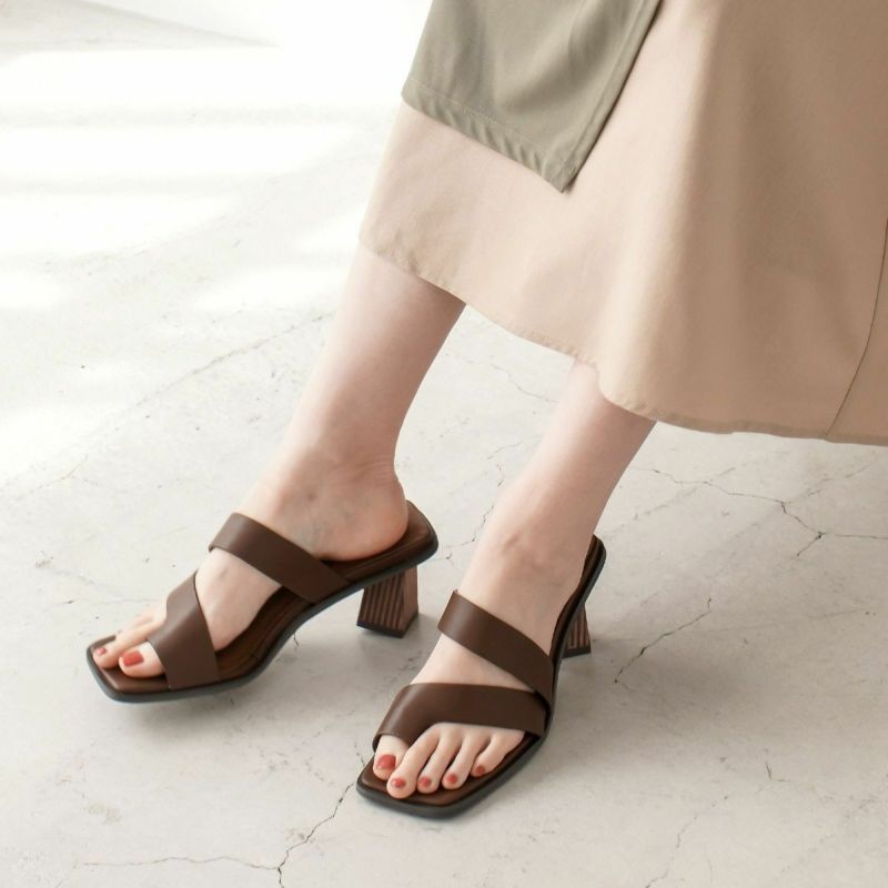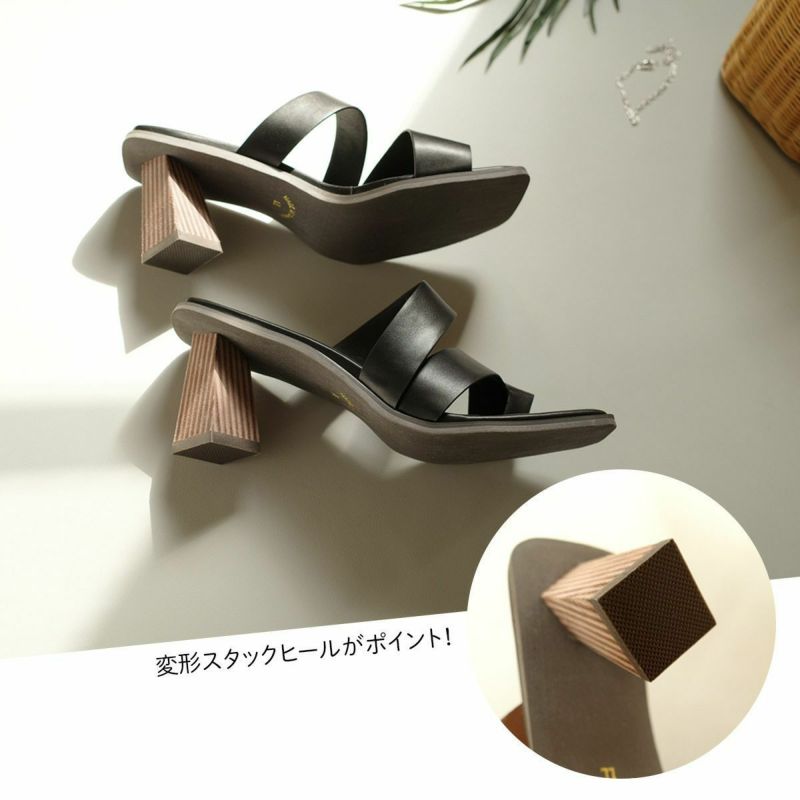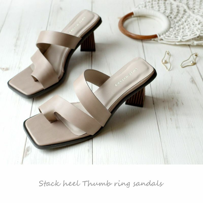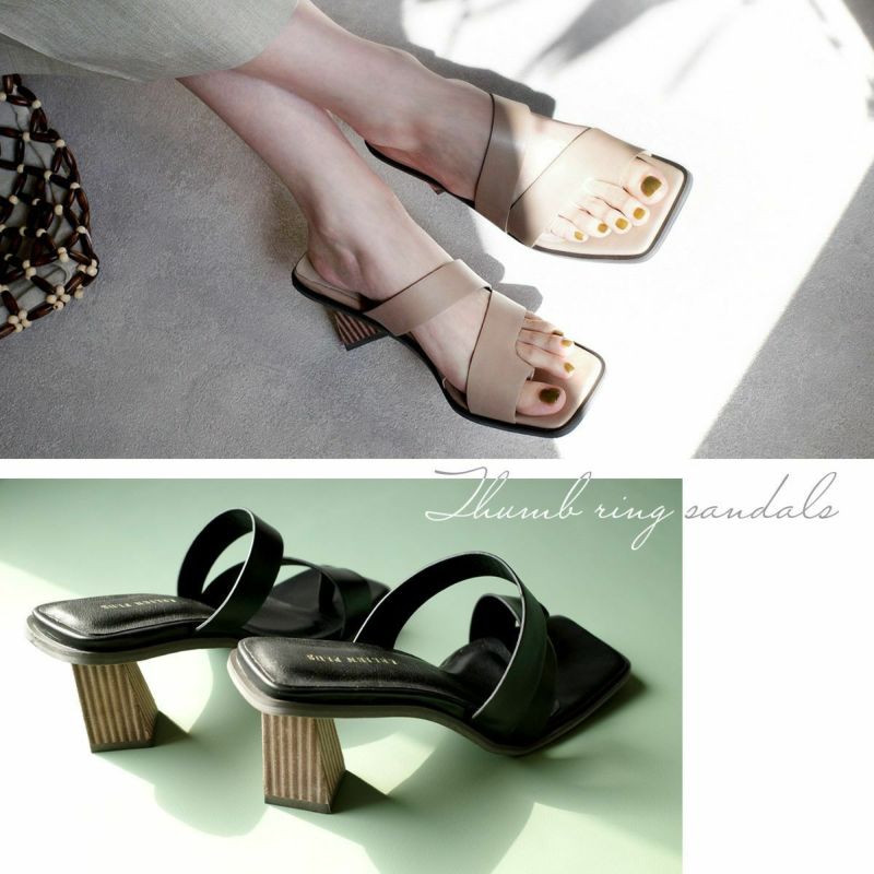 ホールド感があるので高さを感じさせない履き心地。トレンドのサムリングデザインがモードな雰囲気。変形デザインヒールは安定感があり、