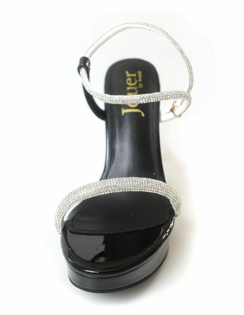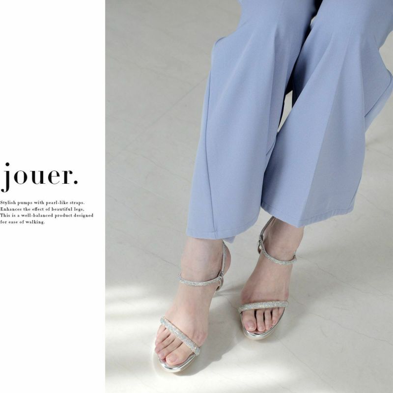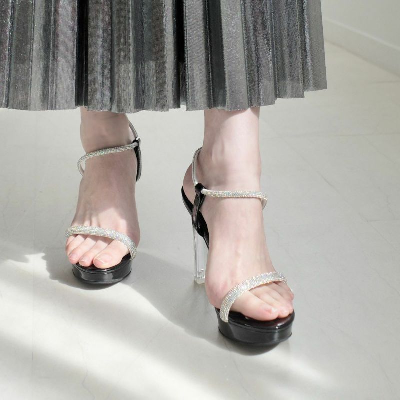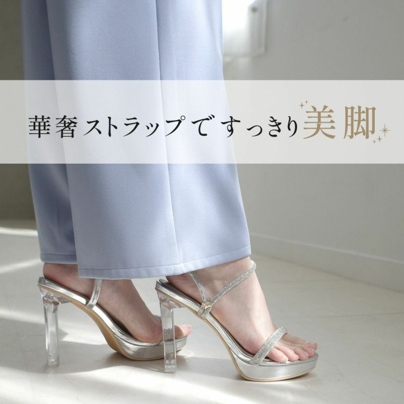 華奢なストラップが足をさらに美しく見せてくれます。ストラップの小粒なラインストーンがさりげなくエレガントさをプラス。