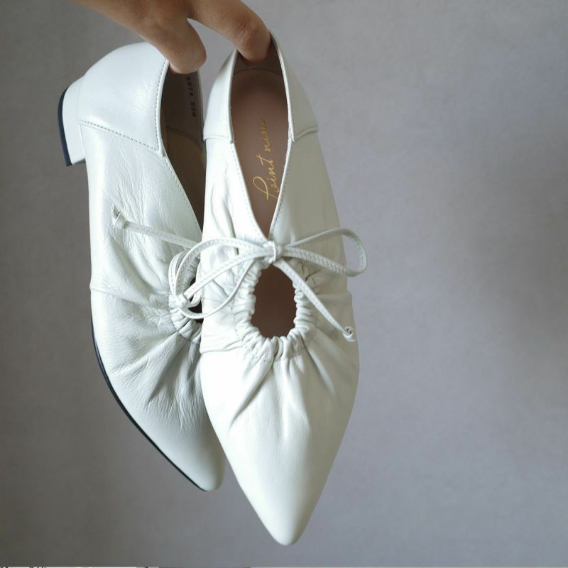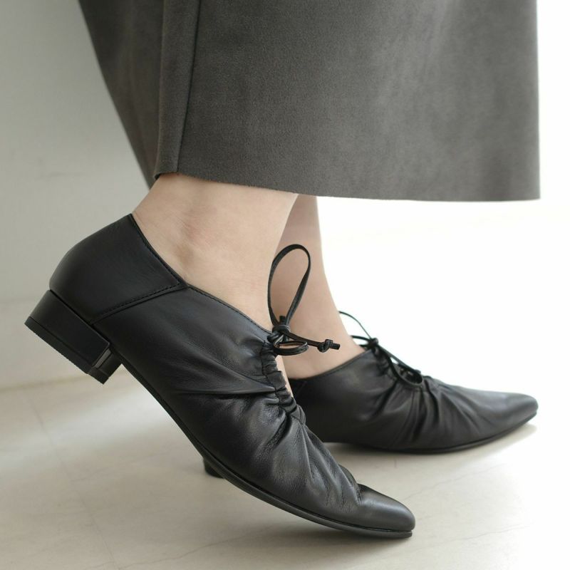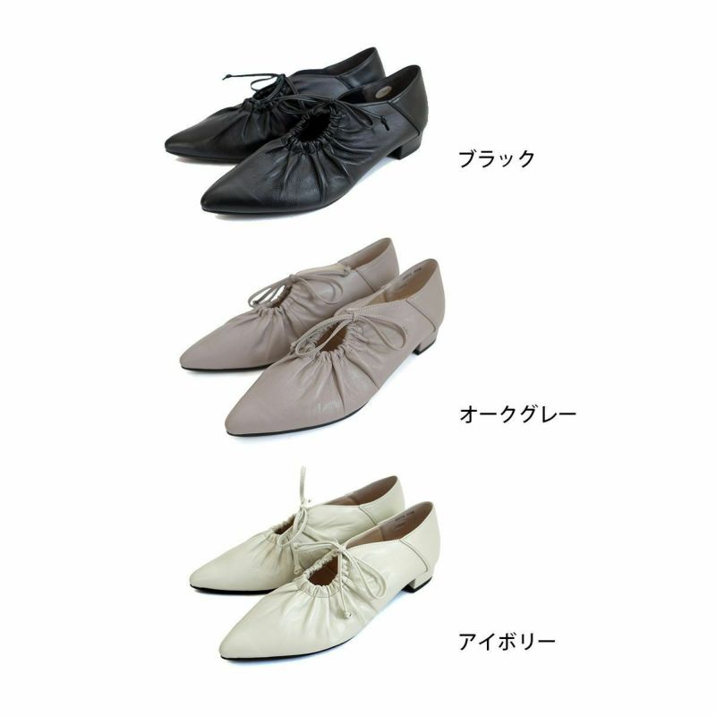 自然なギャザーが美しい大人のポインテッドトゥリボンパンプス。