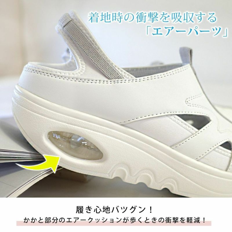 着地時の衝撃を吸収するエアーパーツ入りとソール前後の湾曲形状により無理なく自然な歩行ができる!医療はもちろん、介護の現場でも活躍!働く足を快適にサポート!