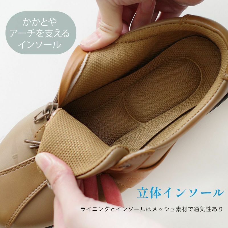 外側にファスナー付きで靴紐を結んだまま脱ぎ履きできるのもポイントです。