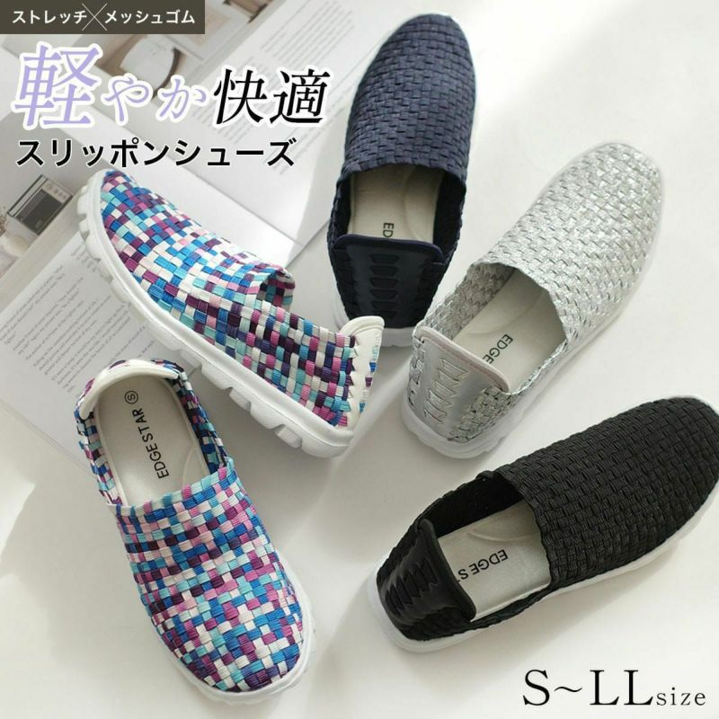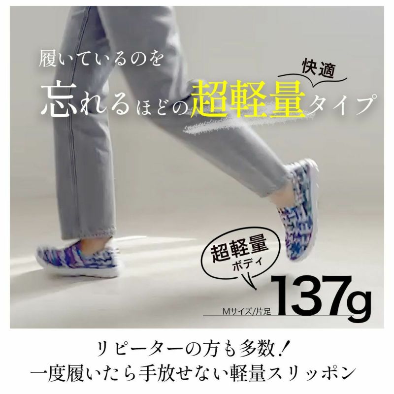 全面メッシュで爽快!伸縮性のあるゴム編み素材だから、ぴったりフィット!履いているのを忘れるほどの超軽量!すっぽりそのまま履ける楽ちんスリッポンタイプ