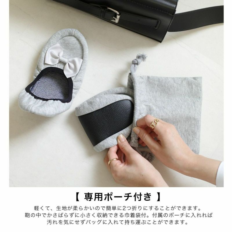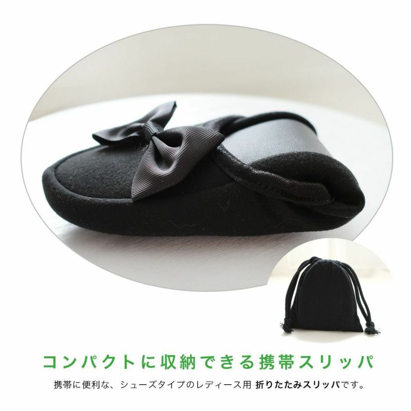■携帯に便利な、シューズタイプのレディース用折りたたみスリッパ/光沢感のあるリボンで上品な印象。生地が柔らかく優しい履き心地です。外底面はビニール素材なので汚れてもサッと拭けます。授業参観、入学卒業式などの学校行事や旅行、冠婚葬祭などで活躍する携帯シューズ。1足持っておくととっても便利。軽くて収納できるので荷物の多いシーンでも楽に履き替えることができます。