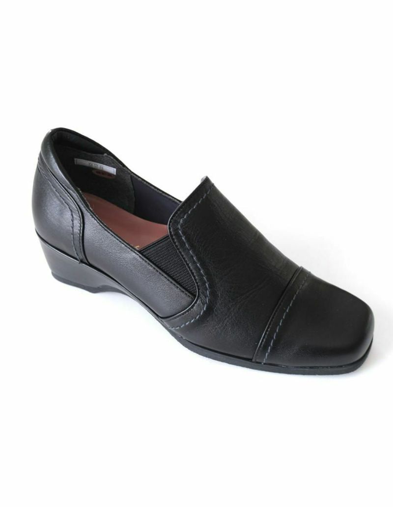 シンプルで合わせやすいスクエアトゥのレザースリッポンシューズ