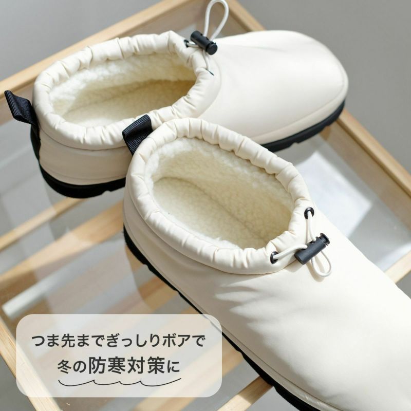 撥水加工のアッパーは水や汚れに強い。ドローコードで調節できて快適フィット。中ボアたっぷりで暖かなインソール。