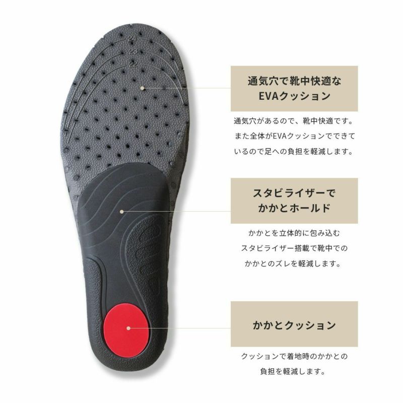保温効果のあるフリース生地には抗菌防臭加工が施されており、靴中の気になるニオイも安心。全体がEVAクッションでできており、かかとクッションや足のアーチを支えるパッド入りで歩行をサポートし歩きやすさがアップ。