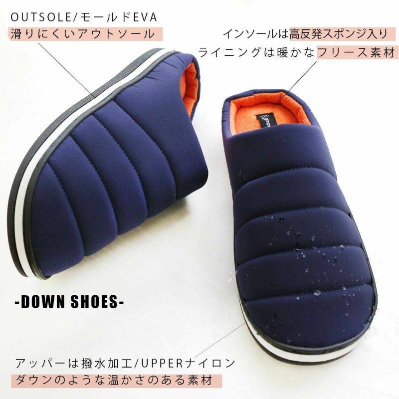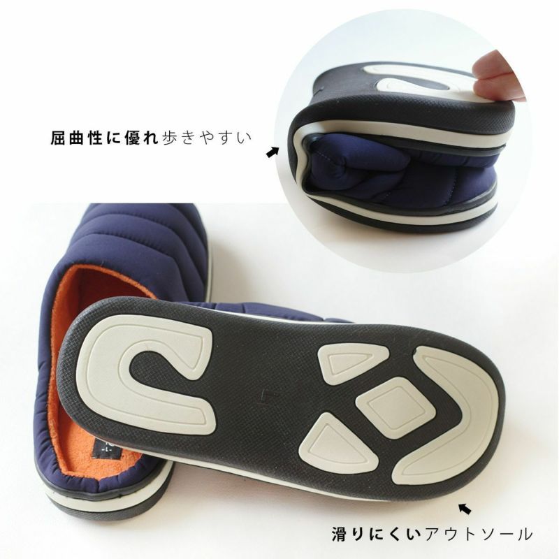 外履きはもちろん室内履きやアウトドアなどにも使える!気軽にスポッ!と履けダウンのような表情に内側フリース素材で、足元あたたか!