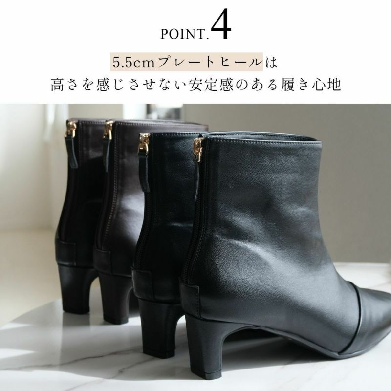 スクエアトゥとプレートヒールでデザイン性をプラスしたモードなデザイン。バックファスナーで脱ぎ履きしやすく、自然と上品な脱ぎ履きに。