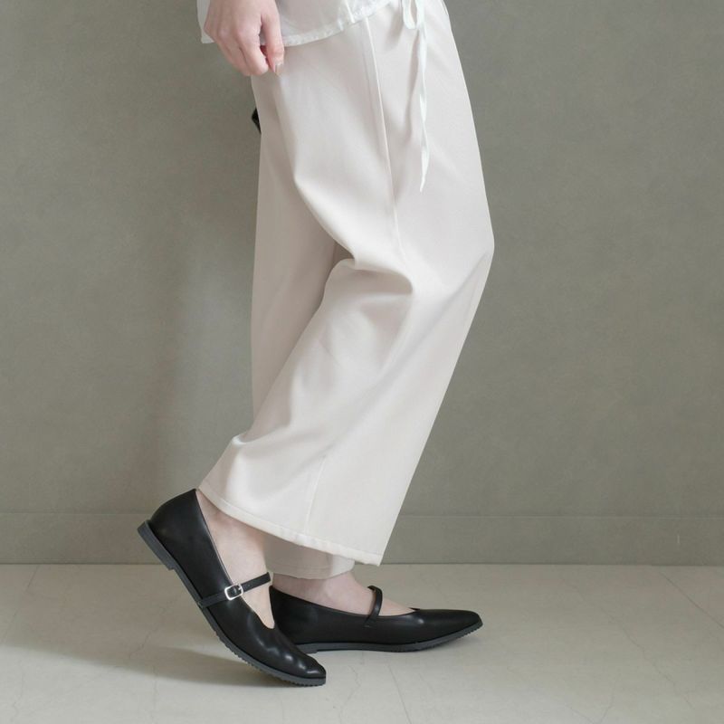 柔らか素材のアッパーとかかとクッション付きで快適な履き心地さりげないコバでモードな印象に。