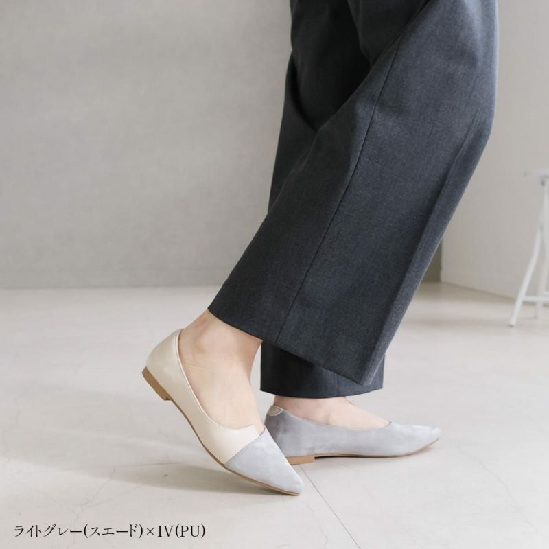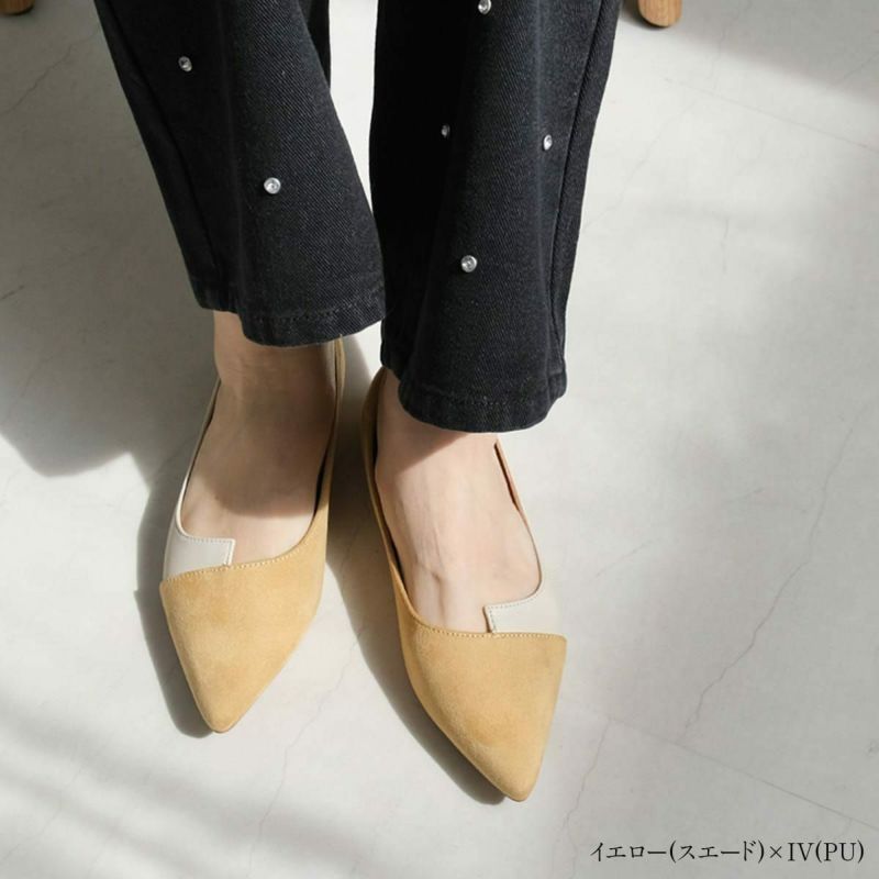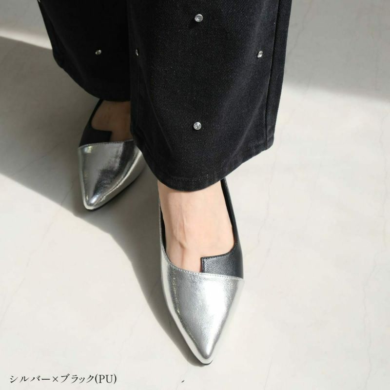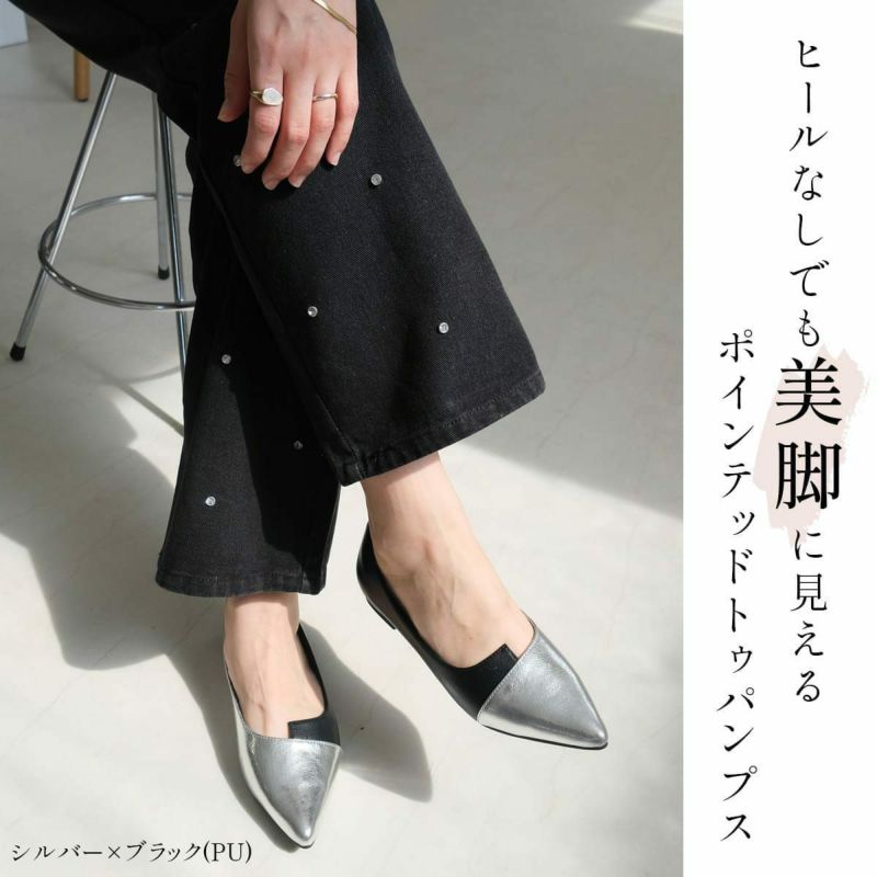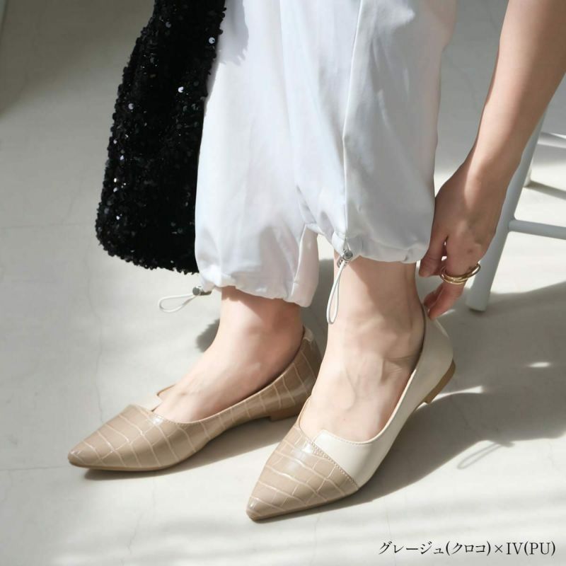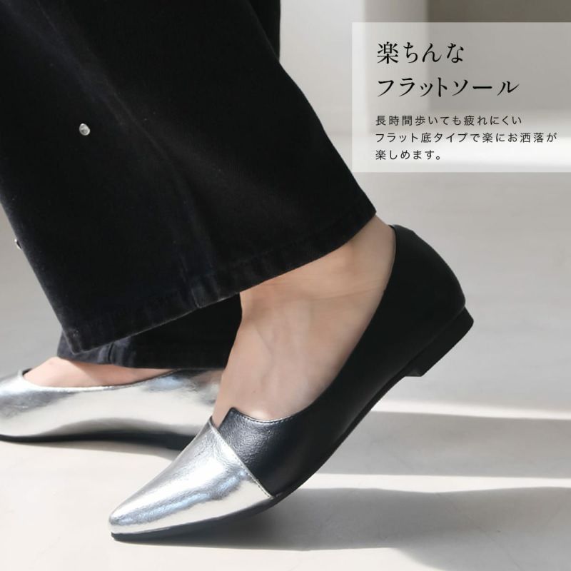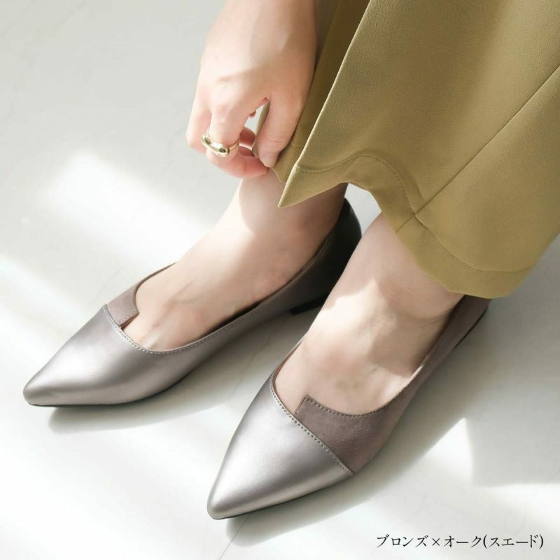 すらりとしたつま先と切り替えデザインが足元にアクセント