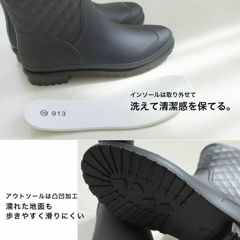 雨の日のコーディネートもお洒落に仕上がるレインロングブーツインソールは取り外し可能 なので洗えて清潔感を保てます。