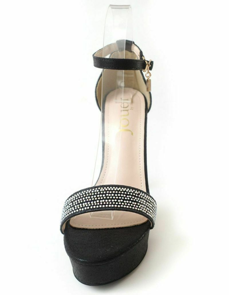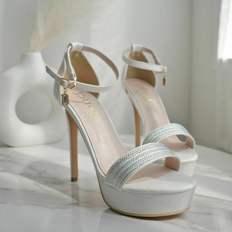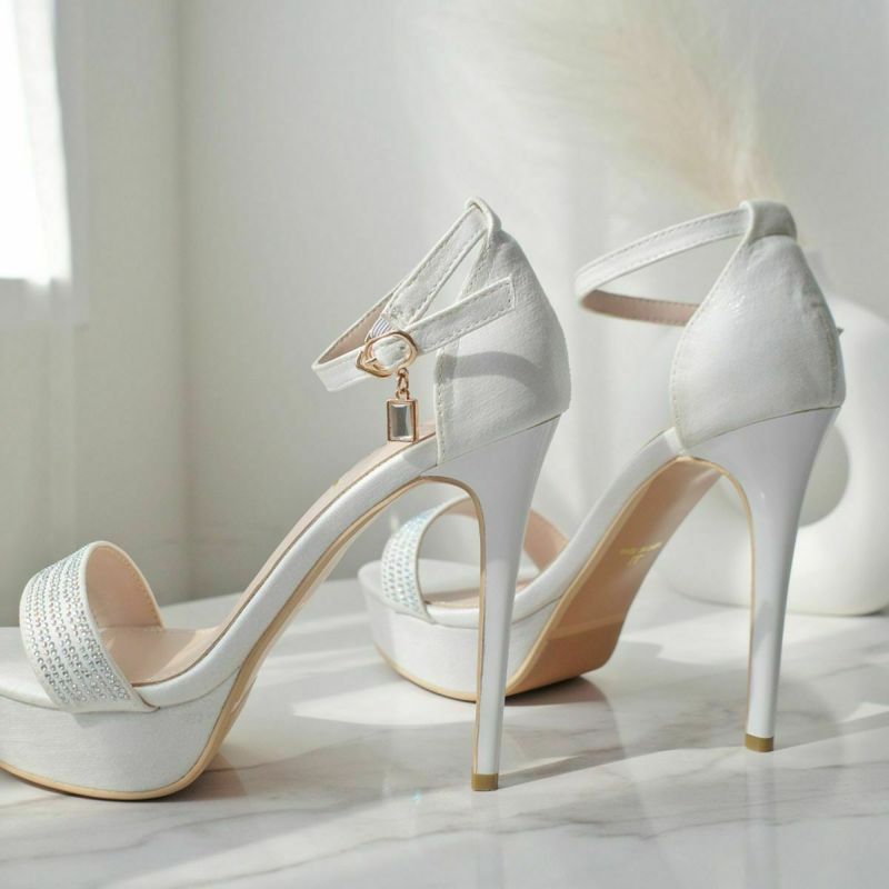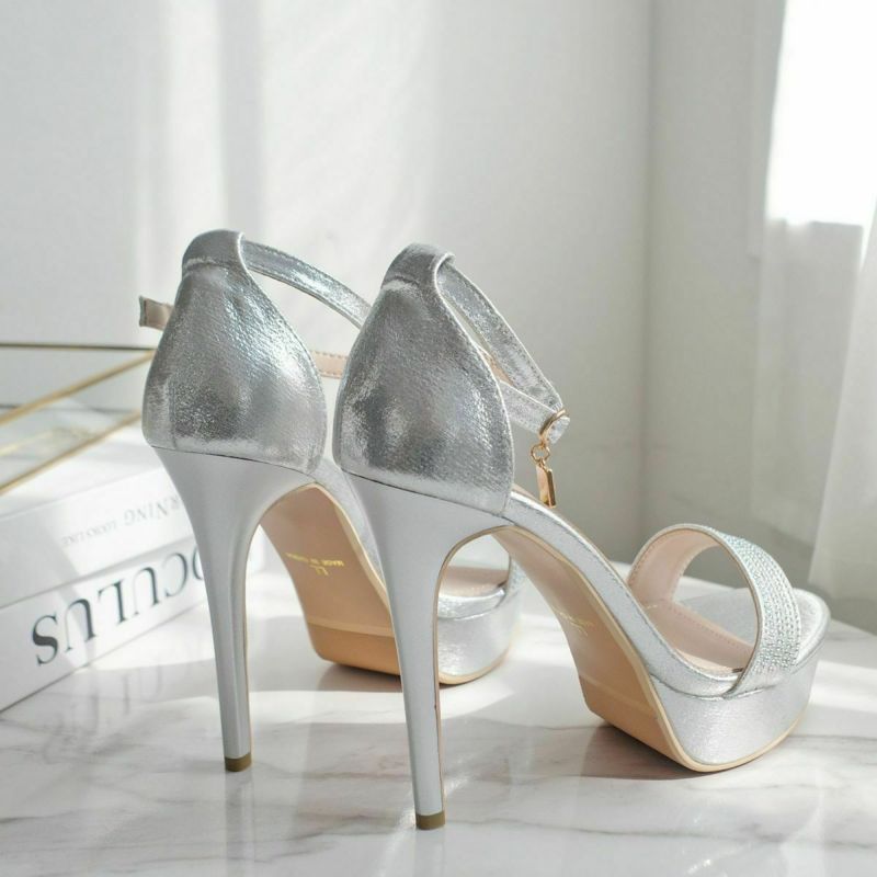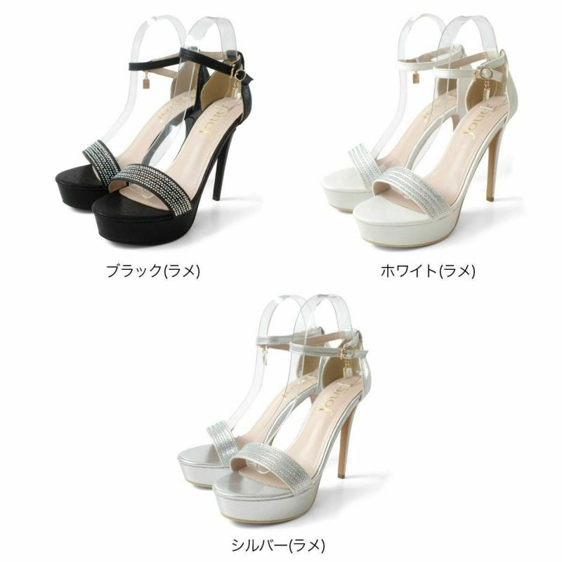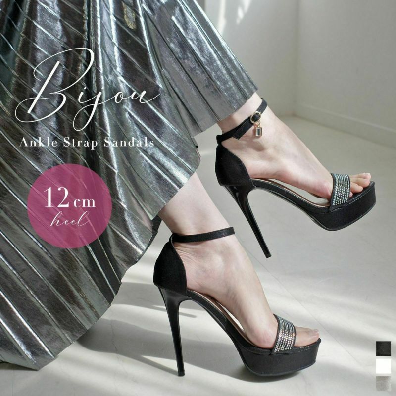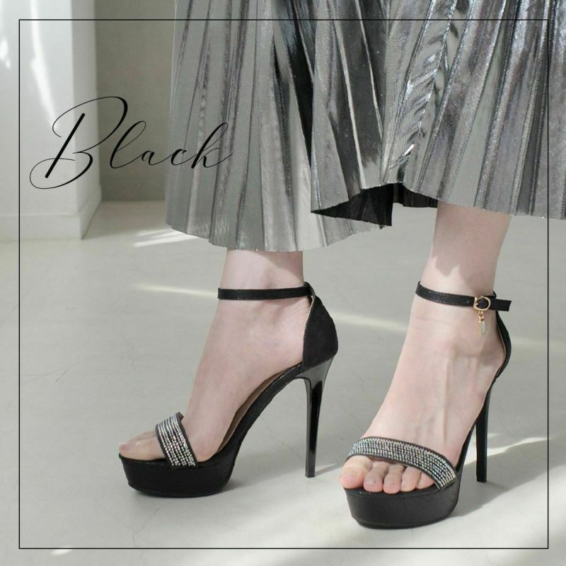12cmのハイヒールが足を長く美しく見せてくれます。甲ベルトの小粒なラインストーンがさりげなくエレガントさをプラス。