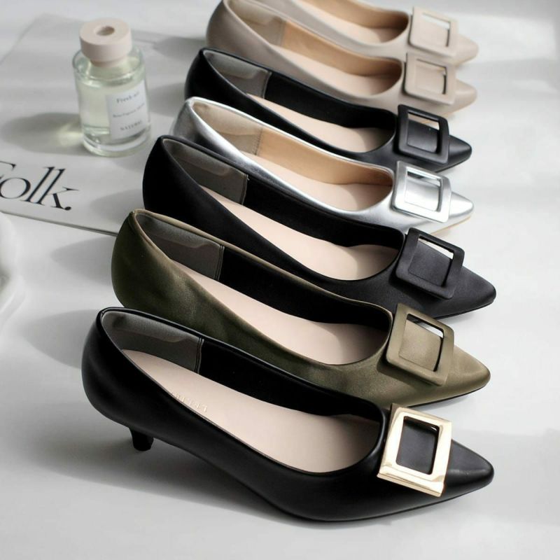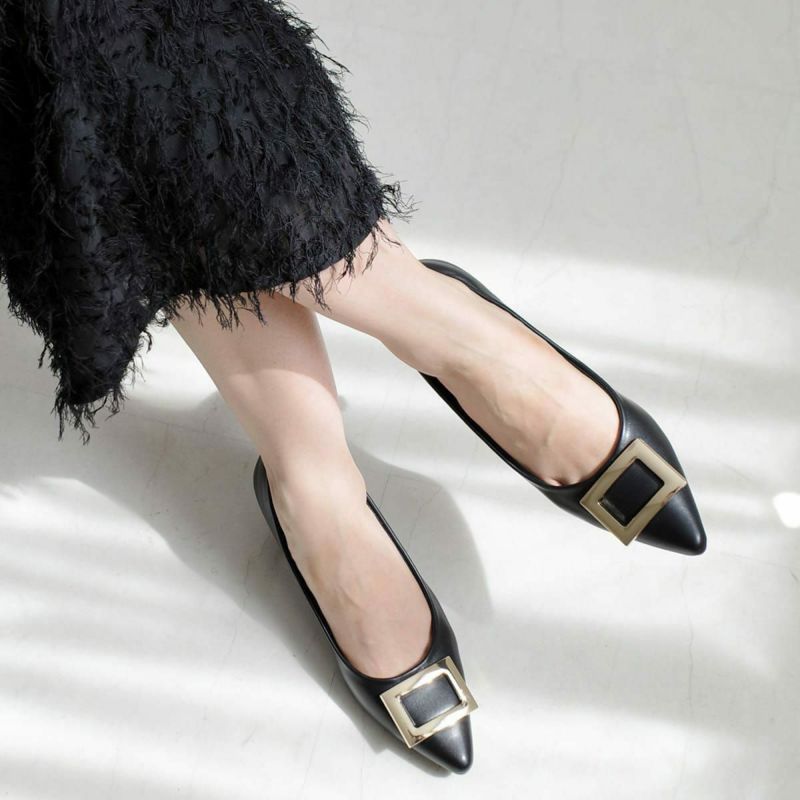 バックルモチーフを組み合わせ、ワントーンの配色で統一しモードな印象に仕上げました。高すぎず、低すぎない5cmヒールで歩きやすさと美脚を叶えてくれます。