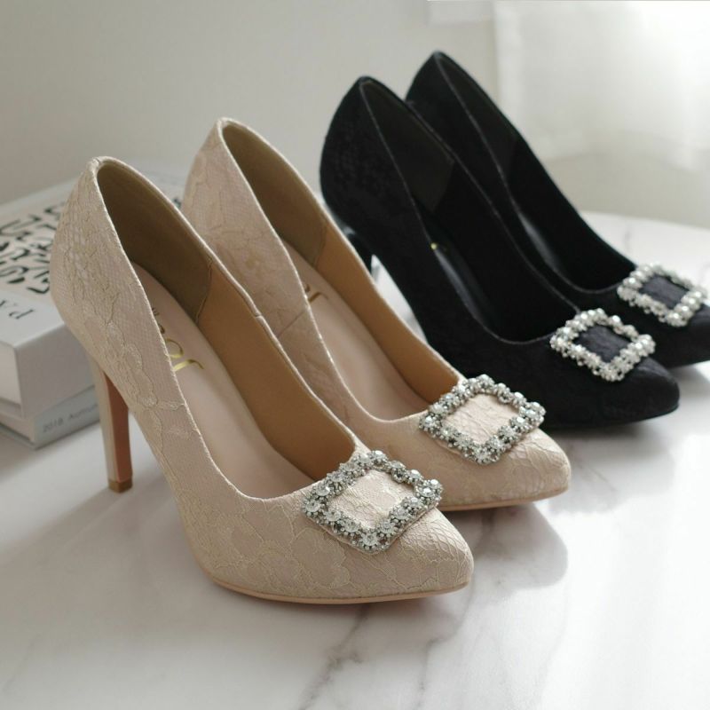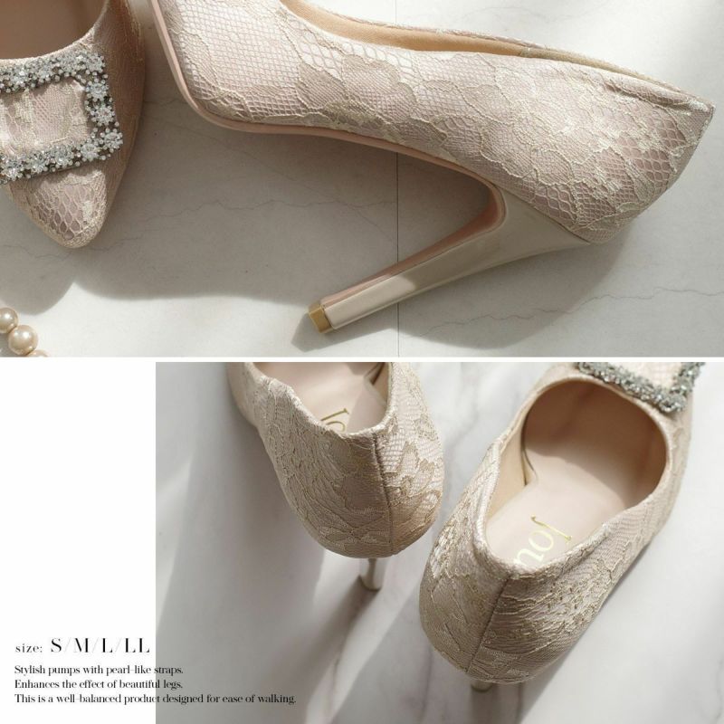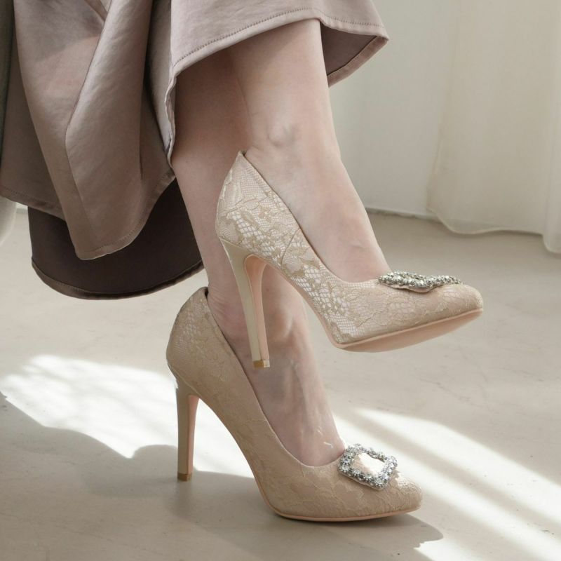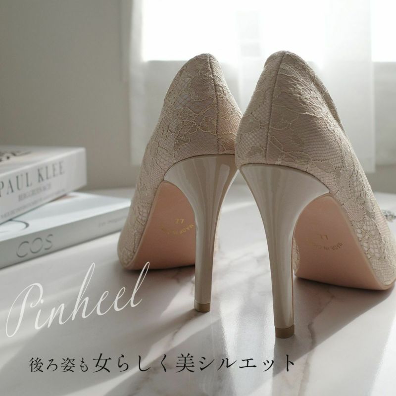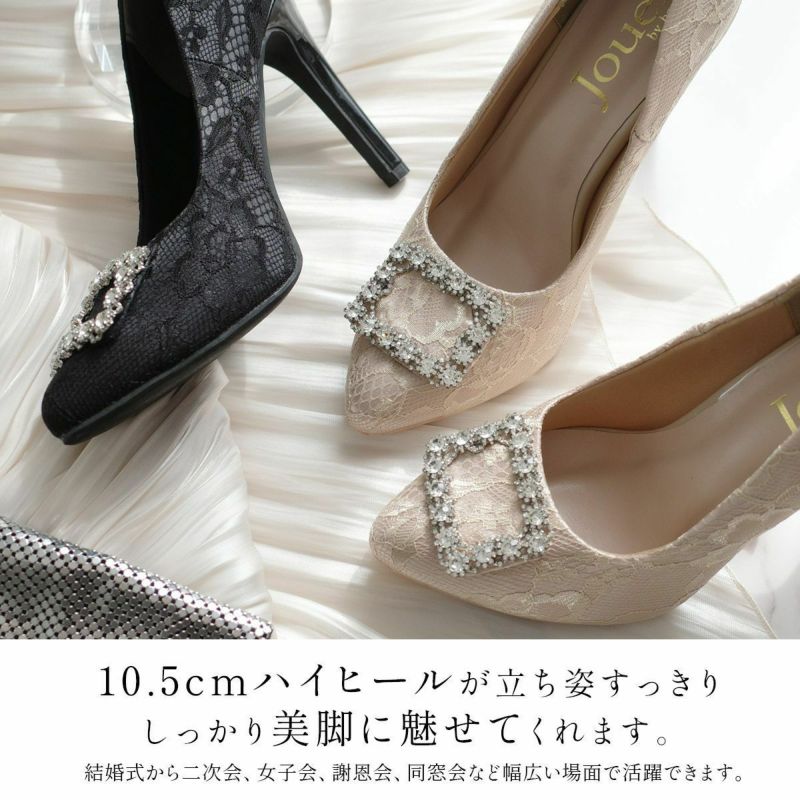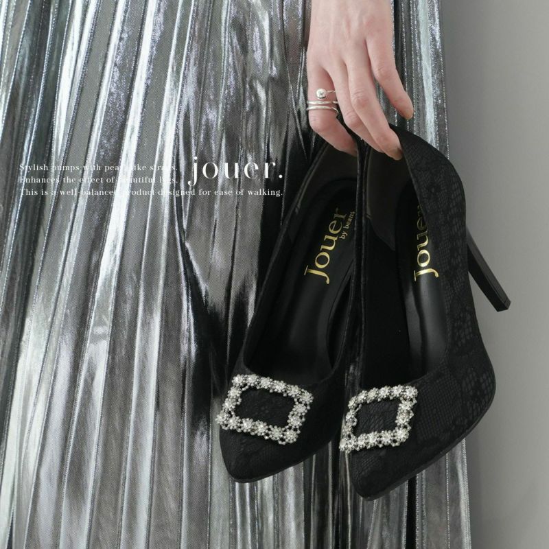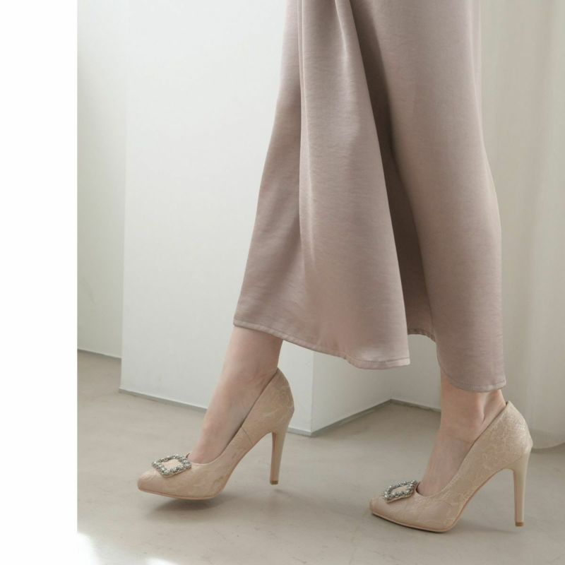 ピンヒールが脚をすっきりと、どこから見ても立ち姿しっかり美脚に魅せてくれます。上品に輝くビジューと主張しすぎないスエードとレースの生地が大人っぽく高級感ある仕上がりに。